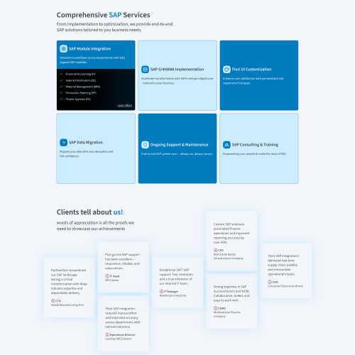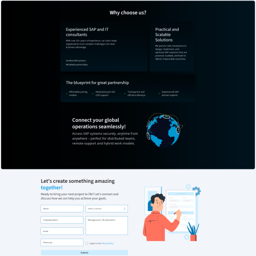 We used multiple layout ideas to present different sections. Highlighting certain content and components that adds value to user experience. We ensured an easy navigation for users looking for information about the company, the services they provide and to get in touch with the company.